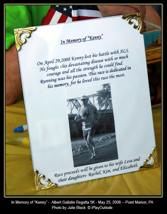 For many years, proceeds from the annual Albert Gallatin Regatta 5K have been dedicated to Ken Frankenberry, a Point Marion resident and long time member of the WV Track Club afflicted with Lou Gehrig disease: Amyotrophic lateral sclerosis (ALS). On the afternoon of April 29, 2008, Kenny lost his battle with the disease.
